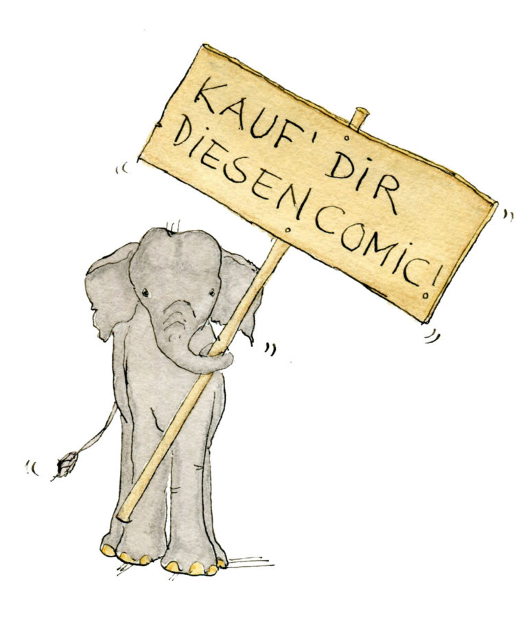 Elefanten, Ein Wissenschaftscomic über die grauen Riesen, 20 Seiten, 21cm x 29,7cm, Klammerbindung, Recyclingpapier, gedruckt in Düsseldorf auf ökostrombetriebenen Druckmaschinen.